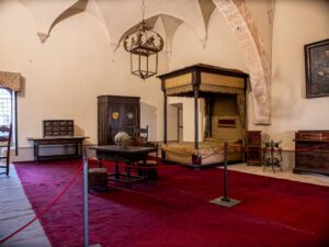 È uno degli ambienti più intimi e significativi del castello. Questo spazio non era soltanto destinato al riposo, ma costituiva un luogo di rappresentanza, dove l’arredo e la decorazione riflettevano il rango e il gusto del signore del castello.