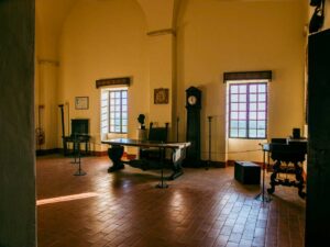 Lo Studio è situato negli ambienti del Maschietto e rappresenta uno degli ambienti più raffinati e significativi del Castello, espressione del potere e della cultura della famiglia Caetani. Non era solo un luogo di lavoro, ma anche un simbolo di prestigio, destinato alla gestione degli affari e alla rappresentanza. Venne concepito come ambiente privato per il signore del castello e, in epoca rinascimentale, quando il castello assunse un ruolo di residenza nobiliare oltre che militare, divenne il cuore intellettuale della dimora, riflettendo il gusto e la cultura della famiglia.