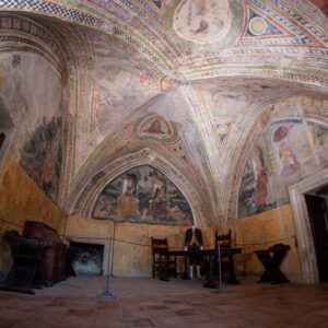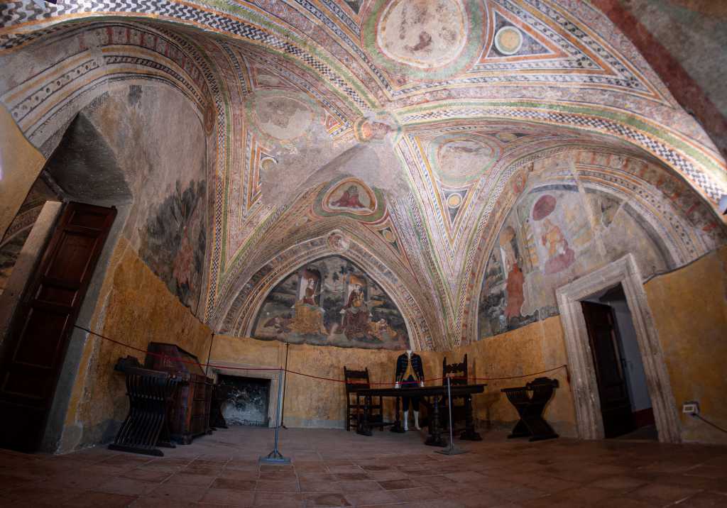 Das Zimmer der Nymphen, oder Stanza delle Ninfe, gehört zu den Camere Pinte, den ausgemalten Räumen des Schlosses der Caetani; es ist ein Beispiel für den Geschmack des späten 15. Jahrhunderts, der die klassische Mythologie zelebrierte.